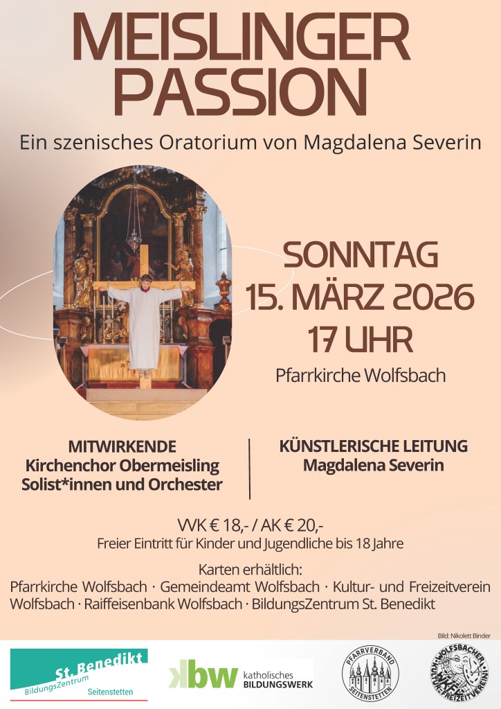 Die Meislinger Passion wird in der heurigen Fastenzeit im westlichen Niederösterreich aufgeführt. Der Kirchenchor Obermeisling ist mit Solist*innen und Orchester am 15. März in der Pfarrkirche Wolfsbach zu Gast.